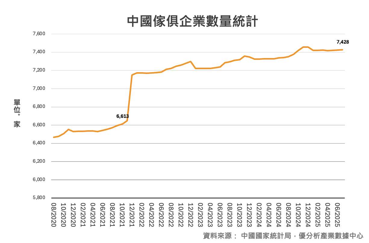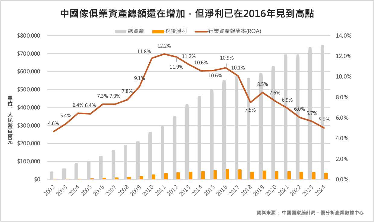 然而,疫情過了之後的整體企業數量仍持續增加了 815 家,帶動資產總額持續上升,更進一步讓ROA資產報酬率惡化至5%。展望未來,中國家具業已難以依靠低價與規模擴張維持優勢,而必須轉向高端化產品與內需市場升級。