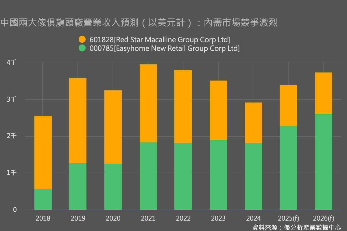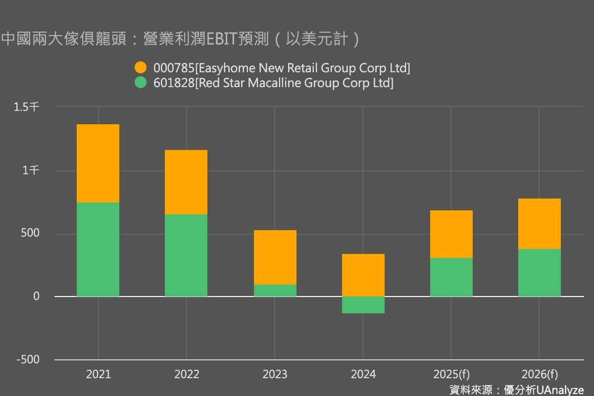從下圖分析師預測的總和來看,整體營收由於中國房地產需求不振所以增長動能有限,獲利也因為相互競爭激烈而難以回到過往高峰,中國傢俱業正面臨一個內憂外患的局面。