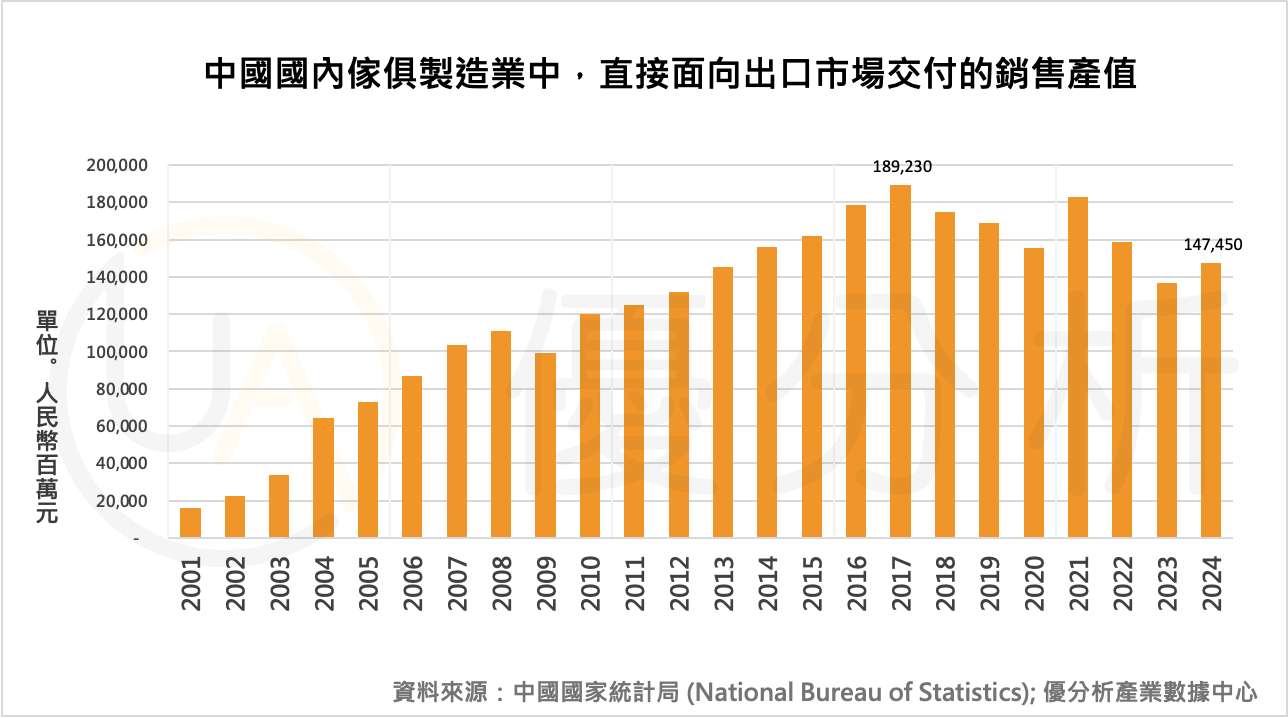 中國是美國最大的家具供應國。2024 年,中國家具製造業的出口交貨值約 207 億美元(1,475 億人民幣),其中大部分都銷往美國。相比之下,中國當年的內需市場規模約 884 億美元。這表示,整個產業約有兩成營收現在高度曝險。這不代表營收會立即消失,只是這些訂單會變得很難賺,進一步讓行業利潤前景惡化。