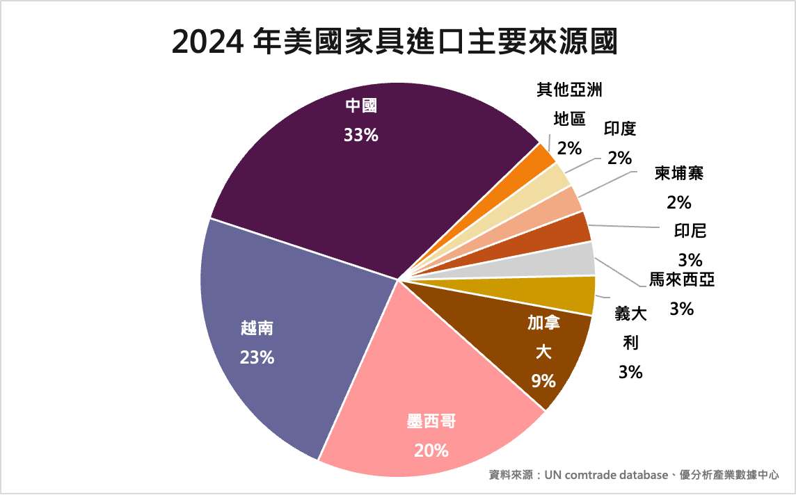 中國仍是美國最大的家具供應國,但占比相較以往已有下降,目前約33%。越南穩居第二,受惠於美中貿易摩擦與產能轉移,近年快速成長,佔比已達23%。美國總統川普宣布,自2025年10月1日起,對所有進口的廚房櫥櫃、浴室梳妝台及相關產品加徵50%關稅,對進口軟傢俱(木質及布藝)加徵30%關稅。