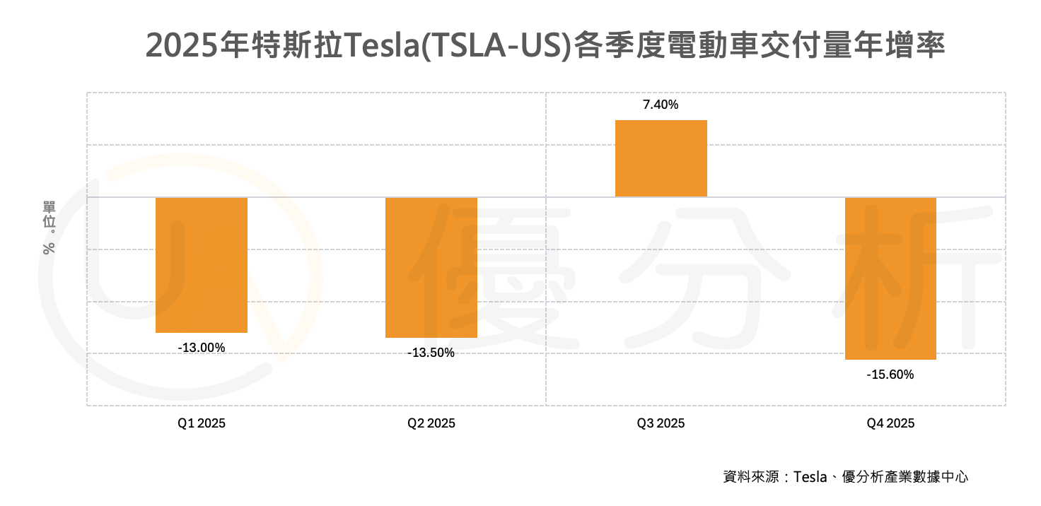 2026年01月03日(優分析/產業數據中心報導)⸺ 特斯拉Tesla(TSLA-US)不再是全球電動車市場的龍頭,2025年全年交車量再度下滑,遭中國車廠比亞迪BYD(002594-SZ)超越。隨著全球電動車銷量持續成長,特斯拉卻面臨政策利多消退、市場競爭加劇與品牌形象爭議等多重壓力,業績明顯受挫。