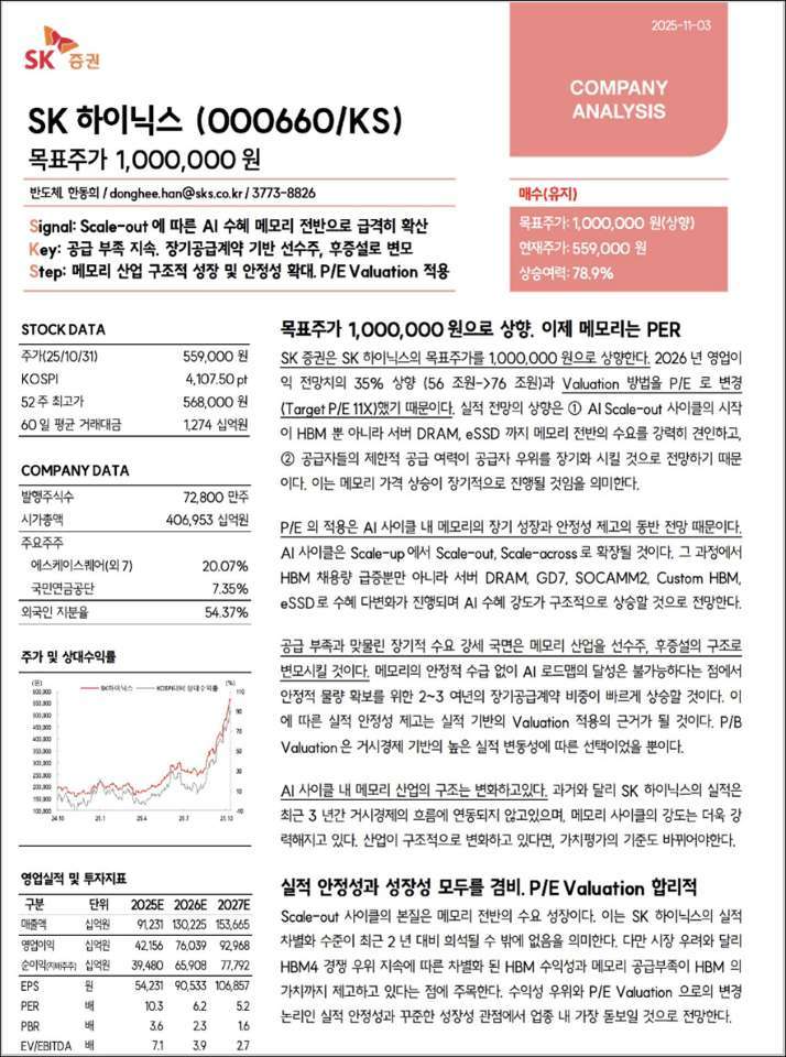 下圖為本週震驚全世界的賣方報告,SK Hynix(海力士) 被 SK 證券調高目標價,一口氣喊到 100 萬韓元 / 股,潛在漲幅 78.9%,而除了目標價之外,其中估值模型的轉變是更值得延伸討論的