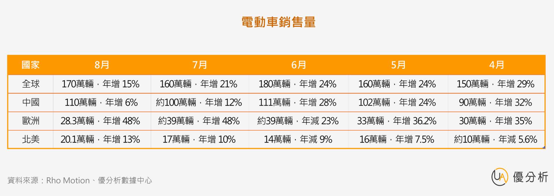 美國市場在稅收抵免即將到期前出現搶購潮,帶動8月銷售上升;歐洲則受惠於去碳化政策與激勵措施,銷量維持強勁。雖然整體增速低於7月的21%,但部分地區需求仍強。而在「全球其他地區」分類中,銷售年增高達 56%,達14.4萬輛。