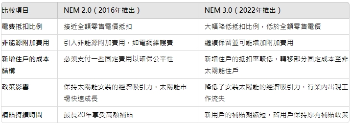 A:電力公司有固定成本要支出,安裝太陽能面板的居民可以透過NEM政策來抵免電費,因為NEM用戶而減少的收入,電力公司可能會提高所有用戶的電費,沒有安裝太陽能面板的居民將承擔更多費用。