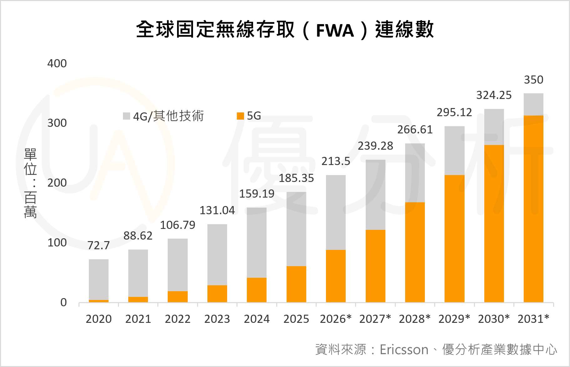 下圖中,全球FWA連線數持續成長,預估到2031年將達到約3.5億連線數。