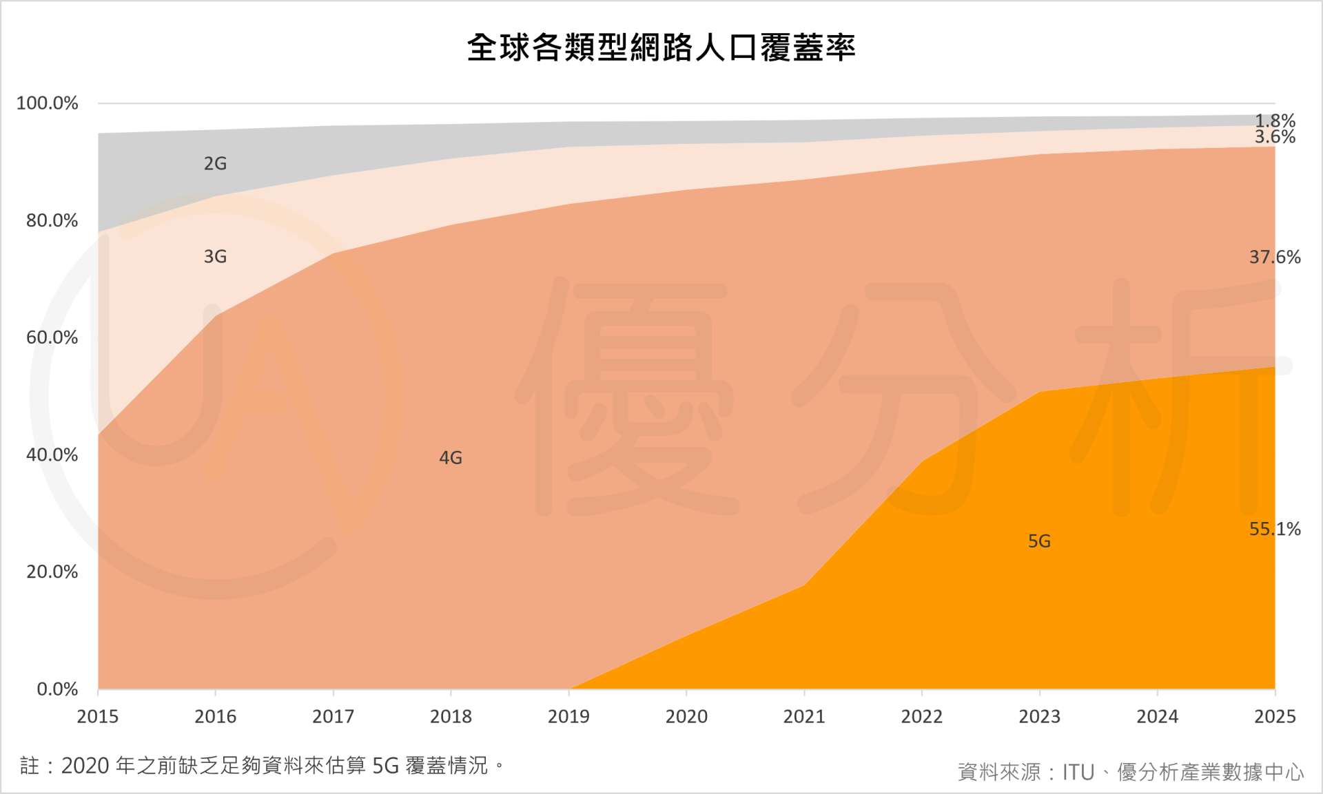 從上圖可以看到,全球約55.1%人口已被5G覆蓋,37.6%人口主要落在4G覆蓋範圍,但仍有3.6%人口只覆蓋到3G、1.8%人口只覆蓋到2G,加總約5~6%的人口仍停留在低速網路。