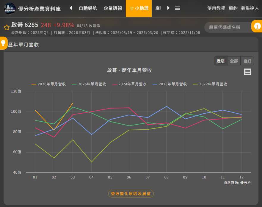 第一季營收達291.56億元,季增8%、年增2.8%,創歷年同期新高,3月單月更來到108.46億元,刷新歷史紀錄。