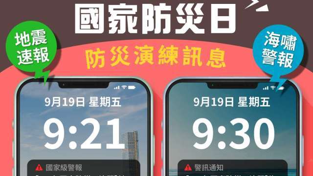 交通部氣象署今 (17) 日宣布,為配合國家防災日演練活動,將於本周五 (19 日) 上午 9 時 21 分發布全國性地震及 9 時 30 分海嘯演練訊息,包括地震、海嘯發生及解除,希望協助民眾提升臨災的應變能力,加強災防告警及緊急警報訊息的實際運作。