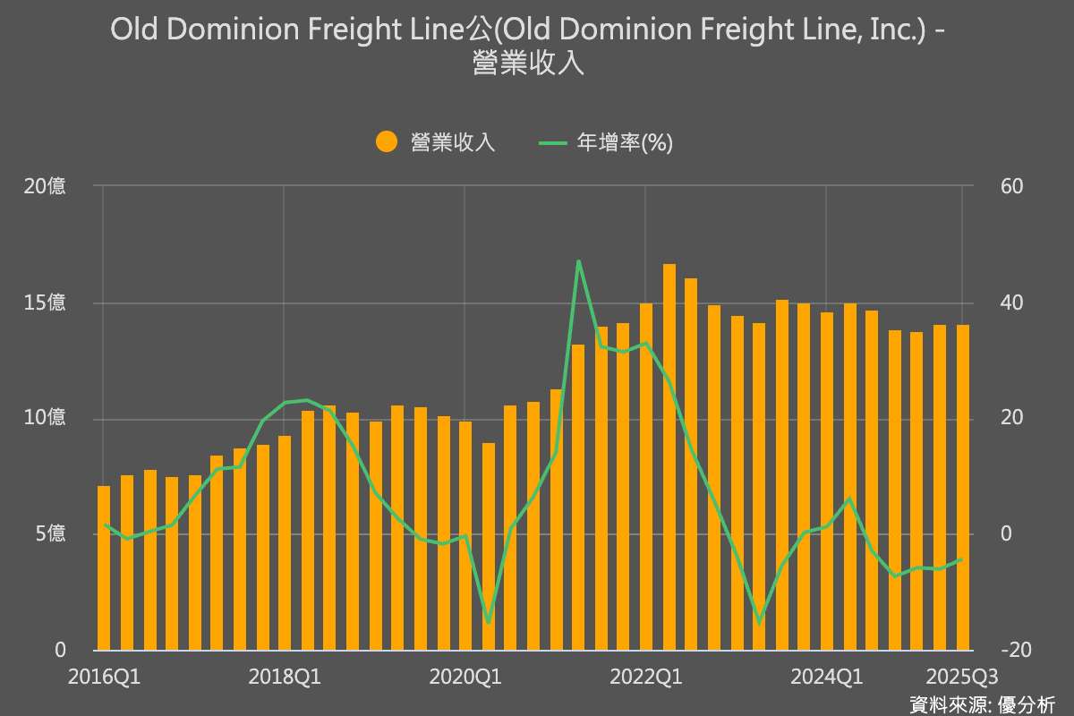 2025年12月04日(優分析/產業數據中心報導)⸺ 北美零擔貨運(LTL)龍頭之一 Old Dominion Freight Line(ODFL-US)公布 2025 年 11 月營運數據,顯示美國經濟持續疲軟正明顯拖累貨運需求。本月貨量下滑幅度擴大,進一步壓縮營收表現,反映物流市場景氣仍待回溫。
