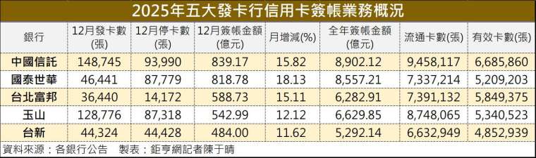 國內五大發卡行 2025 年 12 月信用卡戰報全數揭曉。在年底耶誕跨年節日、雙 12 電商大檔及海外旅遊旺季的強力推升下,單月簽帳金額合計衝上 3,273.67 億元,月增 15%、年增 10.26%,且五家銀行單月增幅均達雙位數。綜觀 2025 全年表現,五大發卡行累計刷卡量達 3 兆 5,664 億元,年增 7.86%,再次刷新歷史紀錄。其中,中國信託銀行單月簽帳金額 839.17 億元、全年累計 8902 億元,毫無懸念蟬聯單月與年度「刷卡王」雙冠寶座。