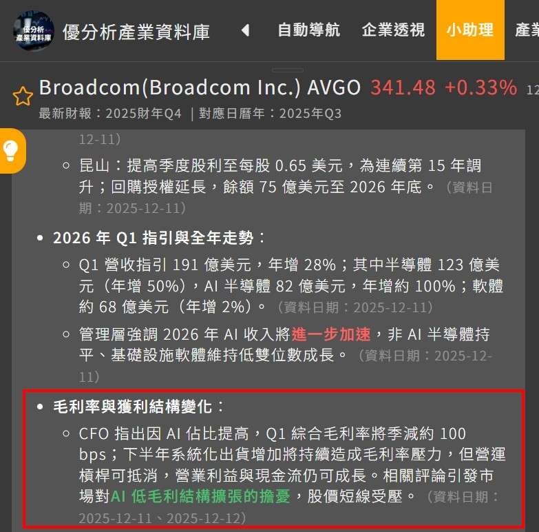 博通高層表示:「我們的 ASIC(客製化 AI 晶片)非常成功,但因為 AI 晶片佔比升高,可能會拉低整體毛利率約 100 個基點(1%)。」