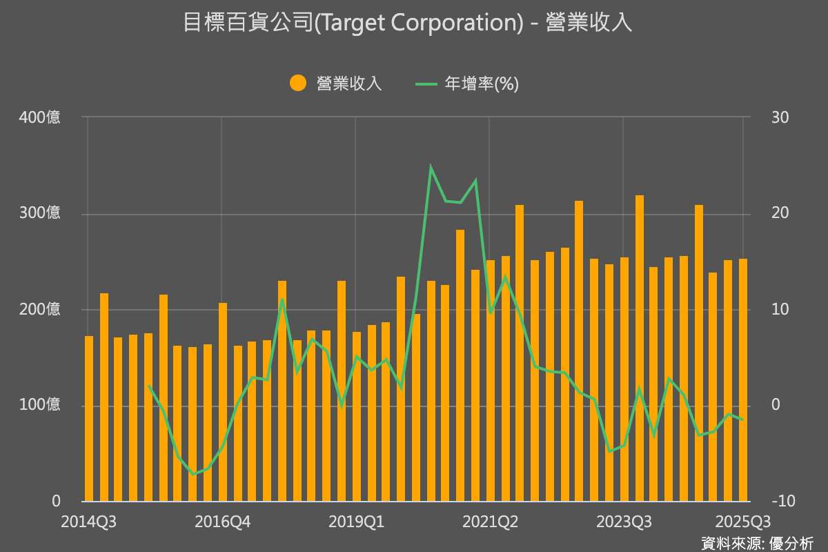 2025年11月19日(優分析/產業數據中心報導)⸺ Target(TGT-US) 週三公布最新財報,這是公司連續第 12 季出現疲弱或衰退的銷售表現。公司表示,進店消費者減少,且有消費者雖仍到店購物,但單筆支出變少。