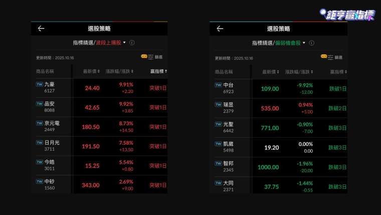 在此期間,投資人可以關注短線正在轉強的個股,參考贏指標選股策略中的「波段上揚股」,此外 J 董也提醒投資人,持股若出現跌破強弱關鍵,建議觀察是否減碼甚至出場,可參考參考贏指標選股策略中的「偏弱機會股」。