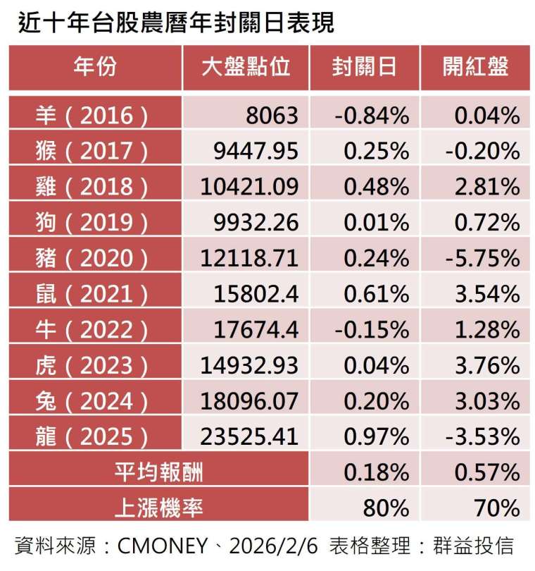 本周三台股金蛇年就要封關,投資人對於是否抱股過年存有疑慮,根據群益投信統計資料顯示,大盤近十年封關日當天上漲機率是 80%,平均漲幅 0.18%,而年後紅包行情可望延續漲勢。市場法人表示,由於農曆春節年假長達 11 天,投資人在分散風險的前提下,抱股過年的最佳投資方式就是選擇台股基金或是擁有不錯配息率的台股 ETF。