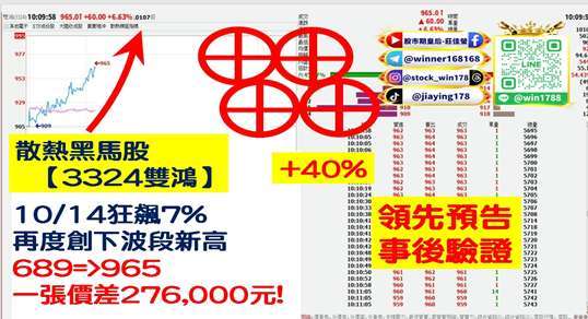 (3324-TW)雙鴻,689=>965 領先預告後大漲 +40%,明顯領漲散熱族群,主要受惠於 AI 伺服器液冷需求持續升溫,GB300 冷板自 9 月起已開始出貨,法人預期第三、四季液冷營收將超越氣冷,全年伺服器液冷營收占比有望突破三成,再加上近期月營收連續創新高,市場對未來成長動能高度期待,吸引法人積極卡位,推升股價創下波段新高,短線多方氣勢強勁。