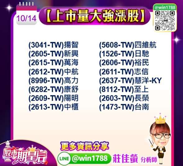 AI 半導體、伺服器及網通族群成為短線主攻方向,權值股方面,(2330-TW) 台積電,上漲 0.71%,收在 1425 元,受惠 AI 題材持續發酵,台積電將於 16 日法說會公布第三季財報,獲利年增 28%,單季淨利上看 4,154 億元,連七季成長並刷新紀錄,法人指出,在(NVDA-US)輝達與(AMD-US)超微等主要晶片廠需求強勁帶動下,AI 伺服器與先進製程訂單暢旺,全年營收可望成長 30% 至 35%,穩居全球晶圓代工龍頭地位;(2317-TW) 鴻海,下跌 3.29%,收在 206 元,將攜手輝達生態系,於 K-1 專案率先導入 800VDC 電力架構,強化 AI 伺服器、電力與液冷整合設計能力,打造安全、節能、可快速部署的 AI 資料中心,該架構專為高密度 AI 運算設計,具模組化與可擴展特性,可降低電流損耗與成本並提升能源效率,並支援輝達多代 GPU 平台,為次世代 AI 應用奠定關鍵基礎;(2308-TW)台達電,下跌 3.69%,收在 992 元,受 AI 伺服器與高效電源管理需求帶動,台達電憑藉電源控制核心技術與全球供應鏈布局,第三季營運全面開花,單季合併營收突破 1,503 億元、年增逾五成,前三季表現同樣亮眼,外資看法樂觀,高盛將目標價上調至 1,300 元並維持「買進」評等,預期第四季在 AI 資料中心與高壓電源需求強勁推動下,營收與獲利可望再創新高,散熱族群方面,表現持續搶眼,(3324-TW) 雙鴻 9 月營收創歷史新高,股價同步改寫新高,(3017-TW) 奇鋐持續強勢攻高,(2486-TW) 一詮則因外資回頭買超而強彈,該公司位階與基期相對低,有望被市場資金帶動補漲,近期更傳出散熱業務捷報,旗下 Metal TIM 銦片成功打入中國 ASIC 晶片供應鏈,Film TIM 銅與石墨烯散熱片亦獲北美 AI 伺服器大廠驗證,可同時應用於 GPU 與 AI 晶片,雙線並進搶攻高階散熱市場,營運動能持續增強,法人看好其後市表現。