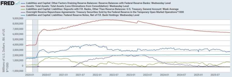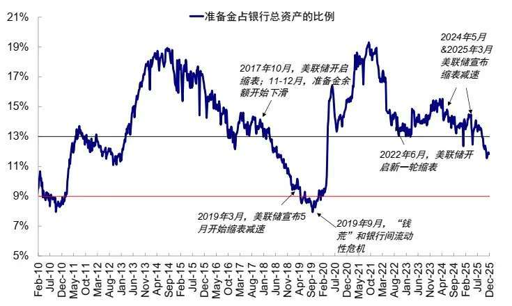 →從上圖中的 FED 資產負債表,可看出深藍色的銀行準備金,先受縮表影響 (紅線),再者從隔夜附買回餘額(紫線) 降至 0,且遭遇政府關門 TGA(綠線)飆高而下滑,縱使政府重啟,TGA 釋放流動性,但目前處於 3 兆的水位,是否緊缺不確定,但至少不是寬裕的,且 1/31 很可能再度關門,認為 FED 是有預判 / 預防性質的舉動。