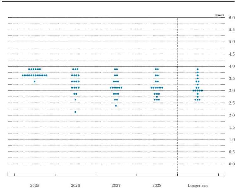 採多數決本次降息 1 碼 3 週以前已被定價,並沒有意外,本次 3 票反對 9 票贊成,而上週提及更應該關注的是點陣圖,如下圖所示,2025 那欄的 19 個點中顯示 6 點反對,13 票贊成 (米蘭贊成降 2 碼),這是 37 年來最大分歧。