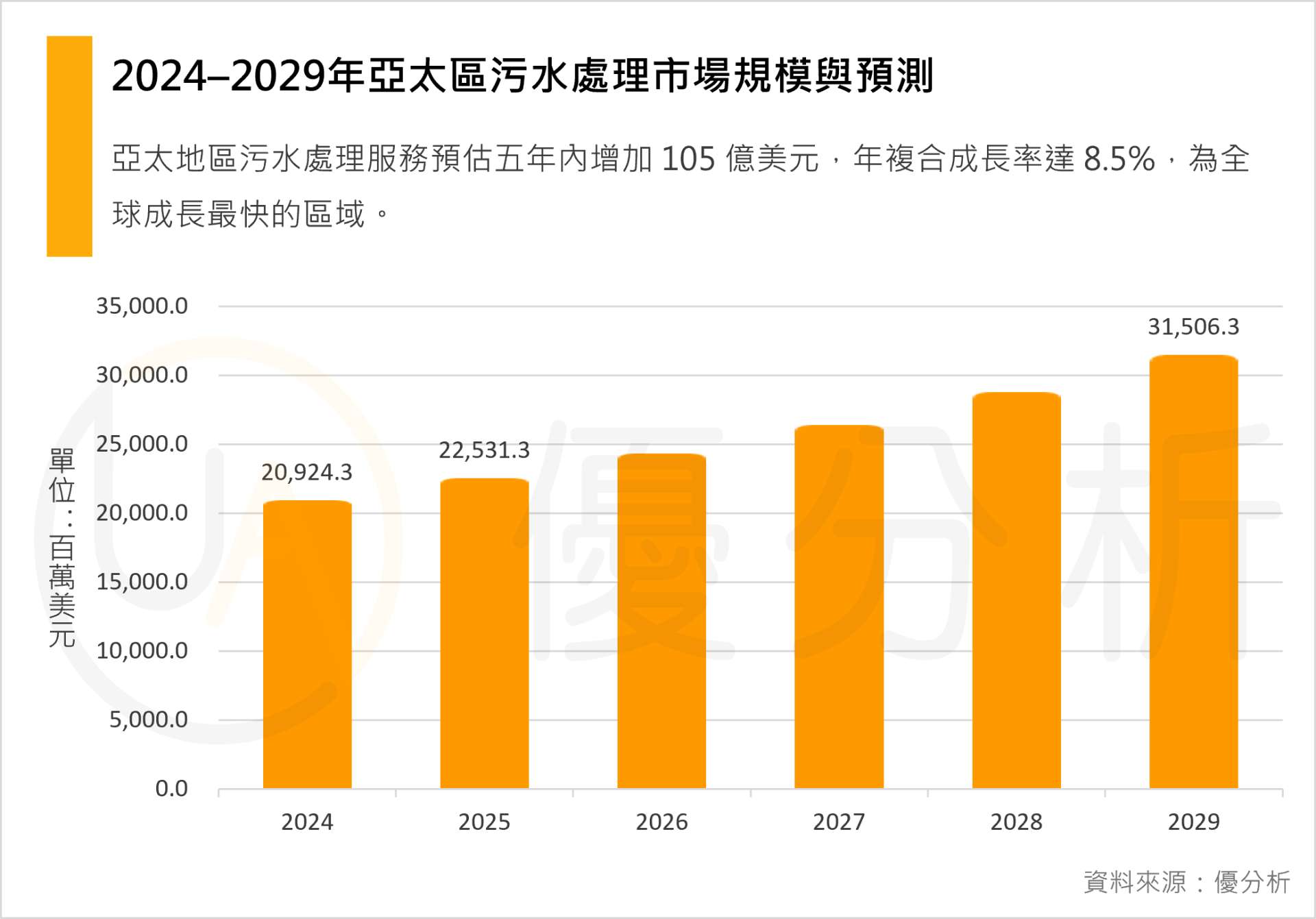 根據優分析資料,全球污水處理服務市場在 2024 年規模達到 668 億美元,預估到 2029 年將成長至 950 億美元,年均複合成長率 7.3%、五年內增加約 281 億美元,等於 2024 年規模的四成以上。