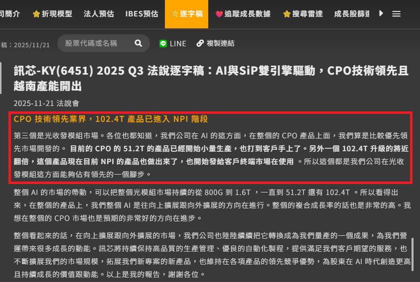 近幾次法說與對外說明中,訊芯-KY 提到公司正逐步把資源轉向高速光纖收發模組、800G、1.6T 與 CPO 等產品,並持續往 AI 資料中心與高速光通訊相關應用發展。
