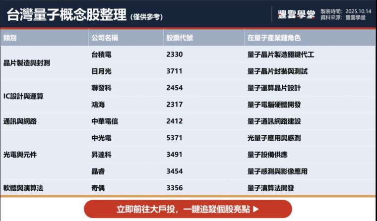 外界普遍看好,台灣憑藉半導體製程優勢與完整供應鏈,有望在量子晶片封裝、量子演算法應用等關鍵環節中搶占先機。量子運算若成主流,這些企業將成最大受益者。
