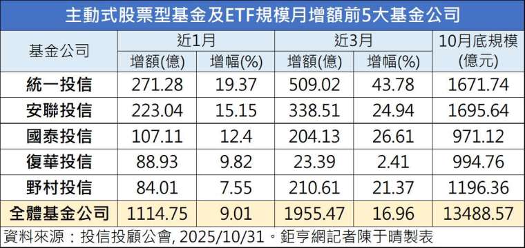 分析投信投顧公會統計至 10 月底數據,主動式股票型基金及 ETF 近 1 月規模增加 1114 億元,光是統一投信就貢獻 271 億元,規模增幅約 19%,遠高於全市場增幅的 9%;安聯投信貢獻 223 億元,增幅約 15%,也有不錯表現。
