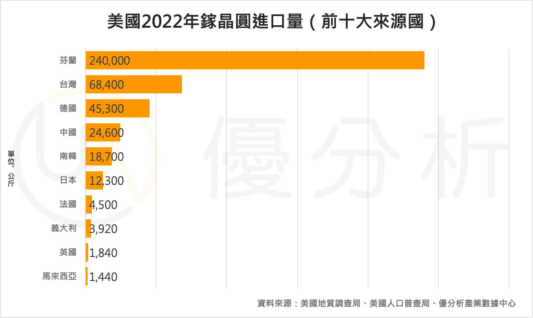 以半導體為例,根據美國地質調查局與美國人口普查局的數據,美國共進口422公噸的砷化鎵(GaAs)晶圓,其中芬蘭以240公噸穩居最大供應國,占比超過一半;台灣則以68.4公噸位居第二。鎵砷晶圓廣泛應用於高頻通訊、雷達系統及光電元件,在國防與5G應用中扮演關鍵角色。