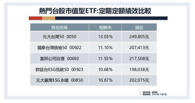 在追求財富累積的階段,大盤型 ETF 因其長期增值潛力,獲得大眾青睞,而根據豐存股資料顯示,以 2025/11/5 收盤價計算,淨值低於 100 元的台股市值型 ETF TOP5 有:元大台灣 50(0050)、國泰台灣領袖 50(00922)、富邦公司治理 (00692)、群益台 ESG 低碳 50(00923) 及元大臺灣 ESG 永續(00850)