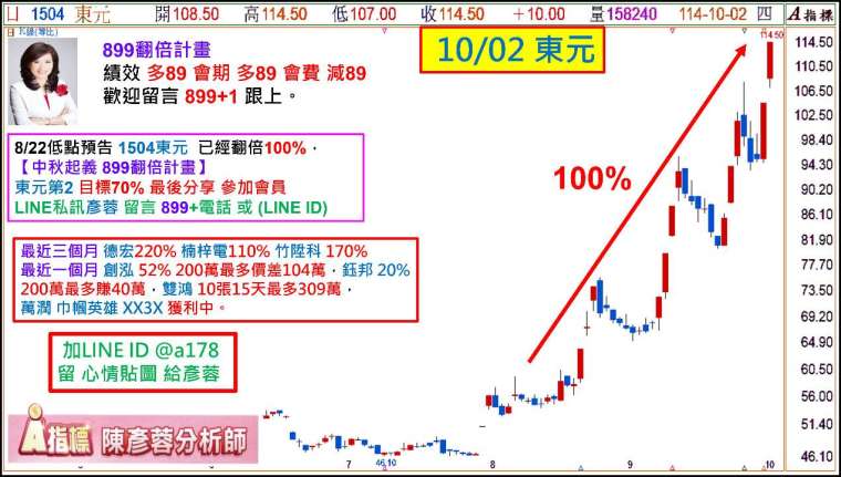 預告 東元 (1504-TW),1.5 個月翻倍 100%。【東元 第 2】,即將發動目標翻倍,加 line 留言【777+2】索取。