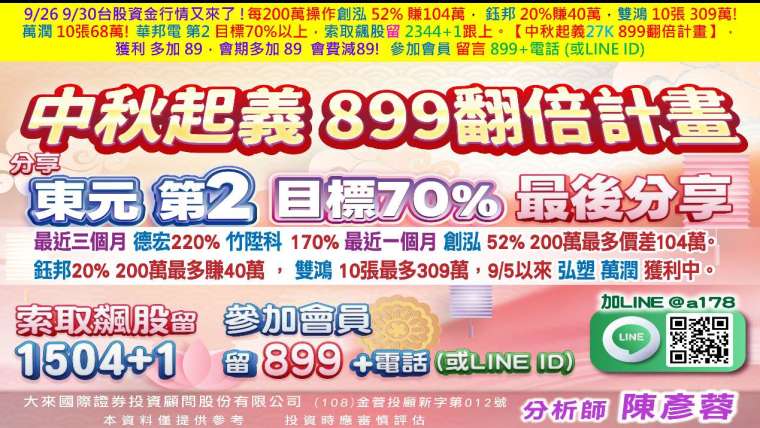 9/4 本欄預告 台股將飛越 26K,9/24 ,26400 達陣! 9/23 說權值股恐怖的來了,果然連殺三天。9/26 盤中 LINE 發文提醒 25500 如守穩,台股止跌上攻擊 27K,台股兩天果然大漲 800 點,有加 LINE 粉絲團留 777+1,與會員,率先得到飆股領先上車提醒。九月會員代表作,雙鴻 15 天 306 元,創泓科技 (7714-TW) 六天 52% 鈺邦(6449-TW) 六天 20%,參加會員一起打拼的朋友,歡迎留 777 + 電話 給彥蓉。
