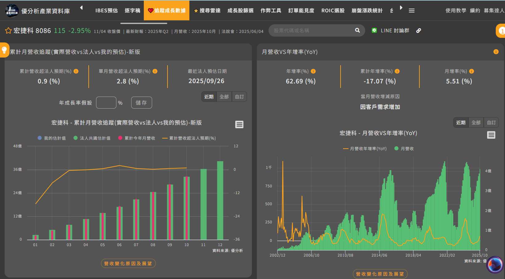 2025年11月05日(優分析/產業數據中心報導)⸺ 宏捷科(8086-TW) 近期股價持續走強,反映市場對其營運動能轉強的信心。公司10月營收達4.1億元,優於市場預期約2.8%,顯示終端需求復甦速度優於法人原先的保守預期。法人指出,受惠於全球智慧型手機市場回暖及主要品牌拉貨動能回升,宏捷科的PA出貨量穩定增加,加上非PA新產品線(如LiDAR、Datacom與無人機太陽能模組)逐步貢獻,推動營收創近16個月新高。