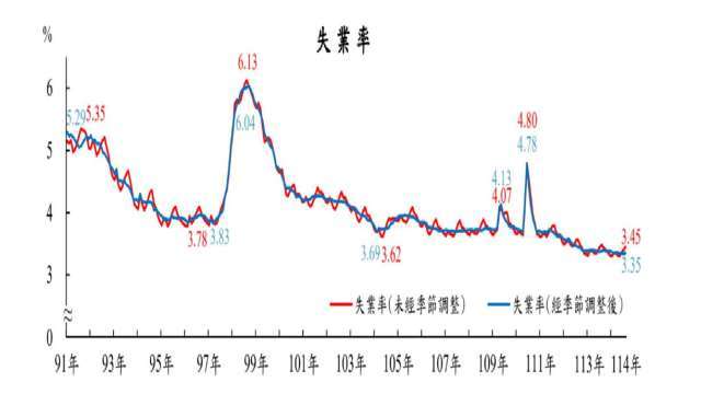 主計總處今 (22) 日公布我國 8 月失業率為 3.45%,月升 0.05 個百分點,年減 0.03 個百分點,不僅連 3 月上揚,並創近 1 年新高,主計總處解讀,除了新鮮人投入職場的季節性因素外,看到對等關稅的影響漸浮現;累計前 8 月失業率平均為 3.35%,年減 0.04 個百分點。