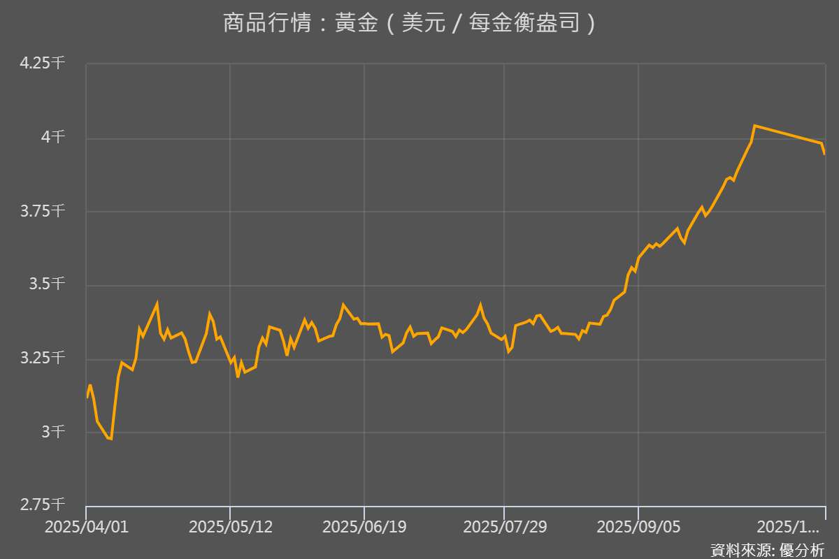 黃金在低利率與經濟不確定性環境中表現良好。自今年以來,金價已上漲約52%,並於10月20日創下每盎司4,381.21美元的歷史高點。這波漲勢主要受到地緣政治與經濟不確定性、降息預期以及各國央行持續買盤支撐。此外,美國美元指數在聯準會會議前徘徊於一週低點附近。