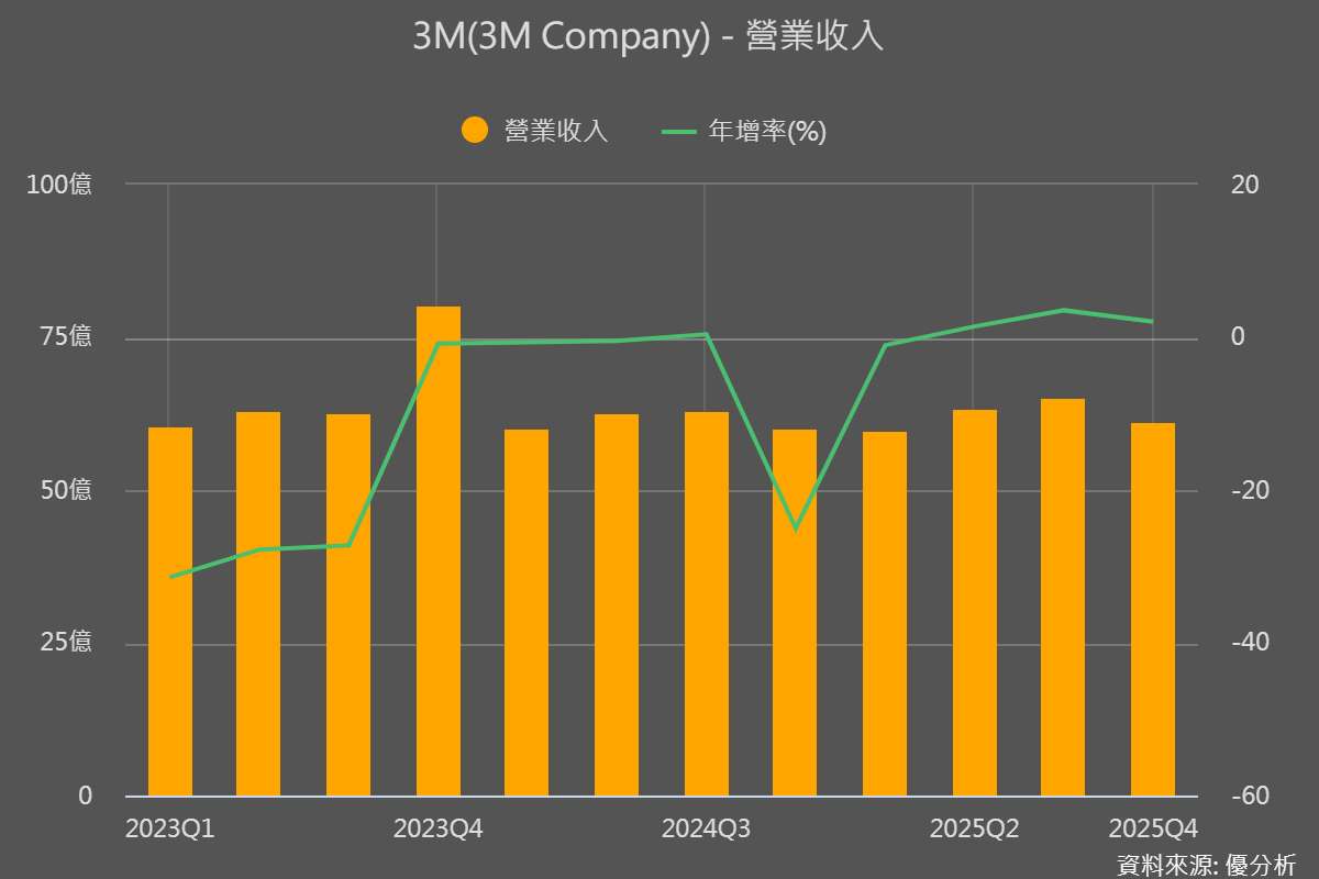 3M 第四季營收約60億美元,年增率 2.2%,符合市場預期,調整後營業利益率提升至 21.1%,較去年同期擴大 140 個基點,每股盈餘 1.83 美元,年增率約 9%。