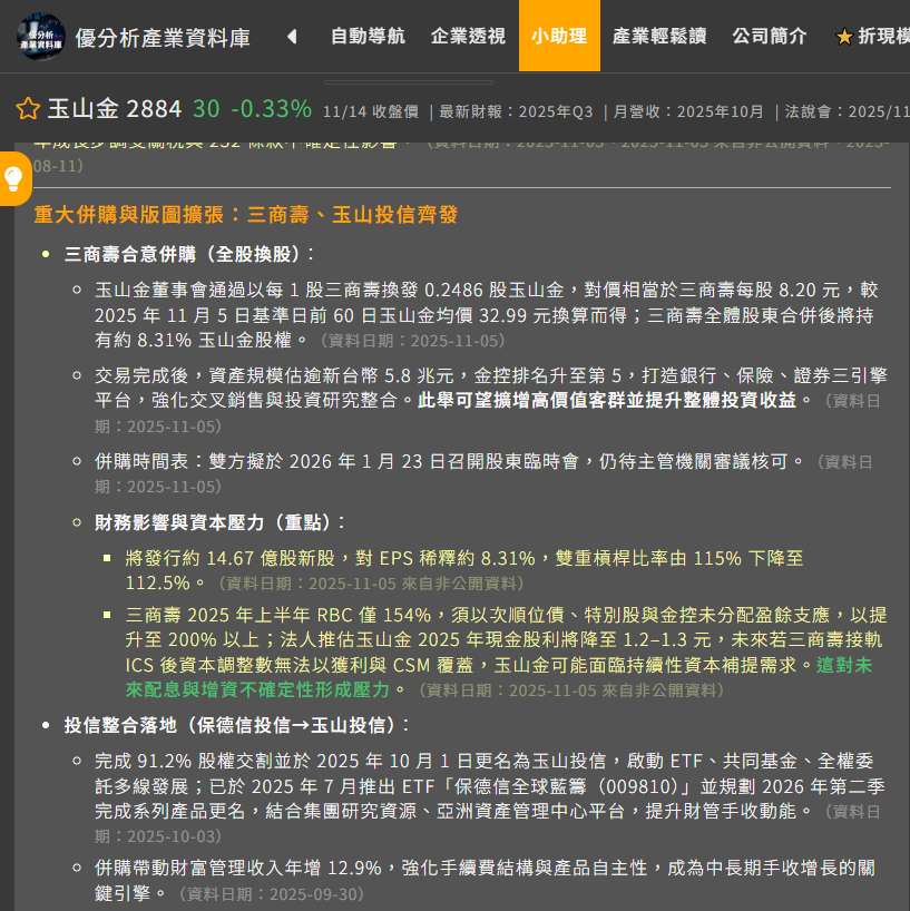 今年,玉山金先併購了保德信投信,取得了發行ETF的入場券;年底再宣布納入三商壽,正式補齊了過去最缺乏的「保險業務」這一塊關鍵拼圖。「從投信到壽險,玉山金正在打造一個更全面的金融帝國,」老牛說,「這對長期的業務綜效與客戶黏著度,絕對是大利多。」