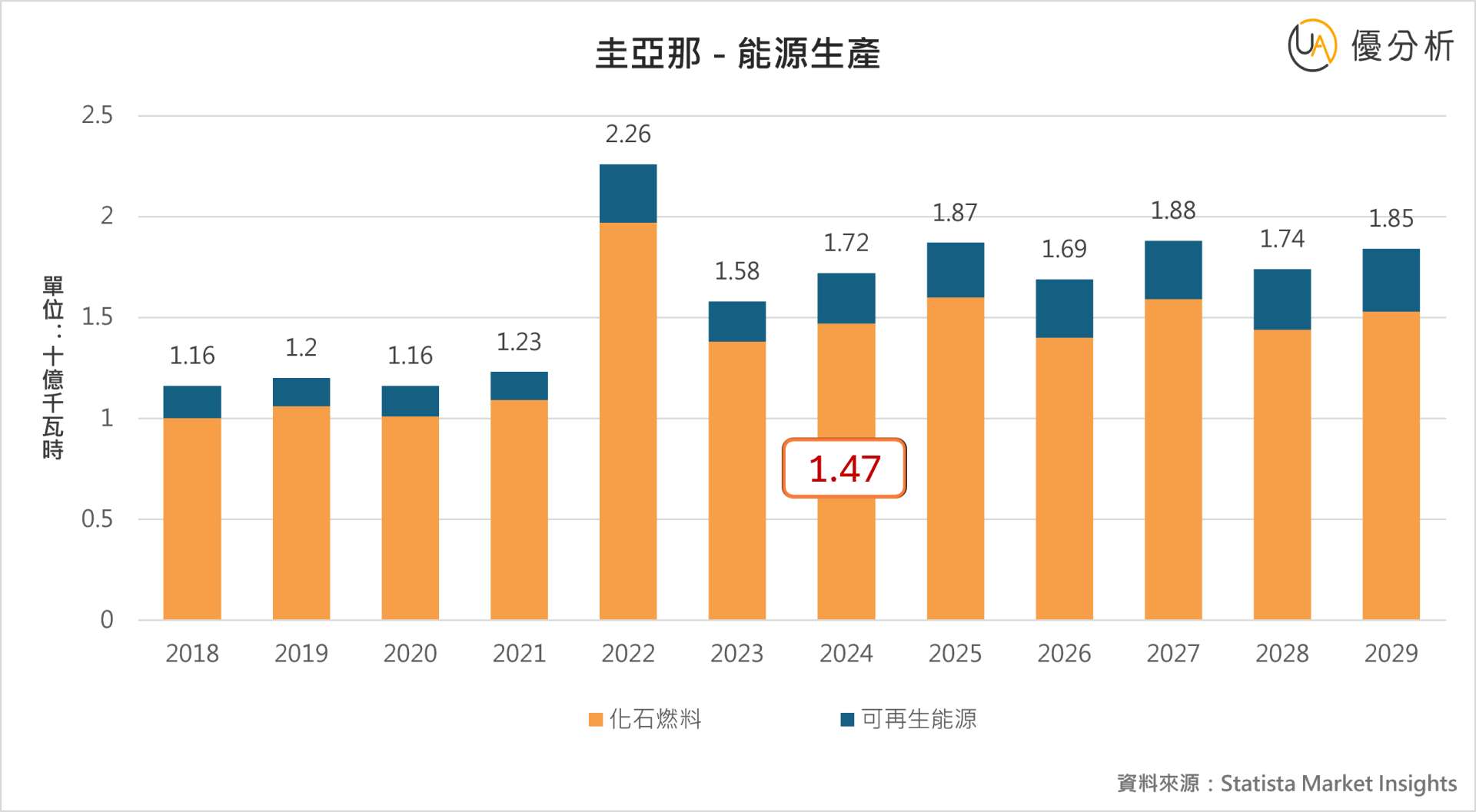 如上圖所示,2024年,該國預計將生產 17.2 億千瓦時的電力,其中 14.7 億千瓦時來自化石燃料。