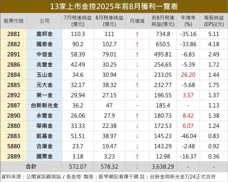 前 8 月 EPS 部分,富邦金突破 5 元、達 5.11 元最高,國泰金 4.18 元居次,中信金 2.49 元,另有 7 家金控 EPS 已突破 1 元關卡。