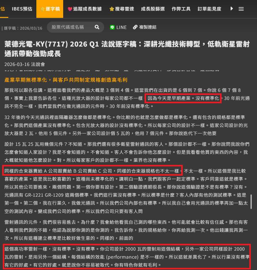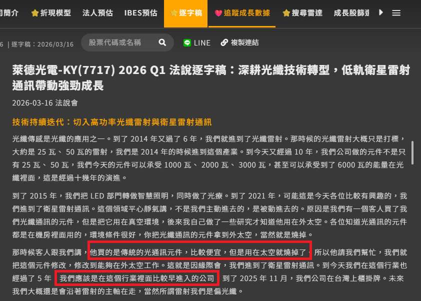 太空雷射通訊相關零組件必須同時處理真空環境、散熱與長時間穩定性,這些都不是一般標準化光通訊產品可以直接轉用的。這點也可以從公司在法說會的說法可以看到。