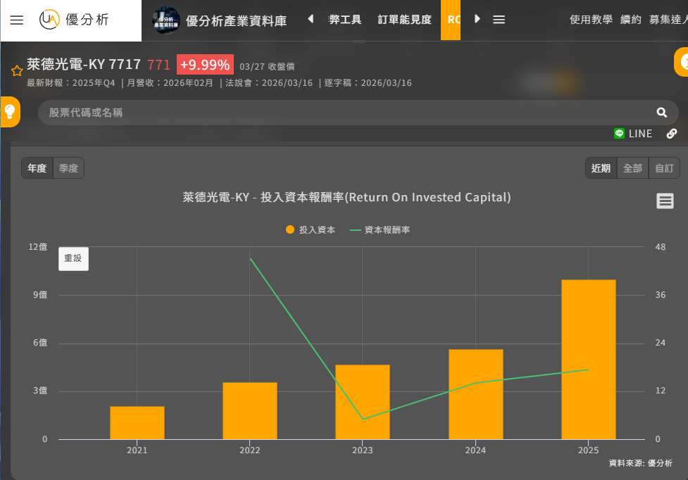 從優分析產業資料庫中打開 ROIC 圖表也可以看到,低軌衛星導入的這幾年公司的投資資本報酬率有明顯回升,這代表公司在早期投入資本之後,並不是只堆出規模,而是開始把投入轉成更好的報酬。