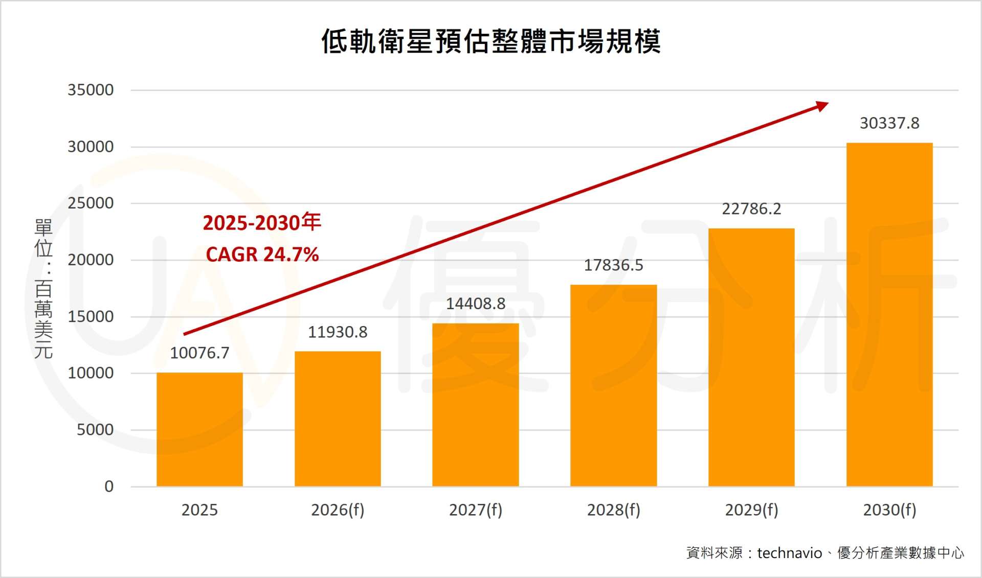 根據調查報告,全球 LEO 衛星市場 2025 年約 100.8 億美元,2030 年預估可達 303.4 億美元,五年 CAGR 達 24.7%;成長主軸很明確,通訊應用是最大宗,北美也是最大市場。