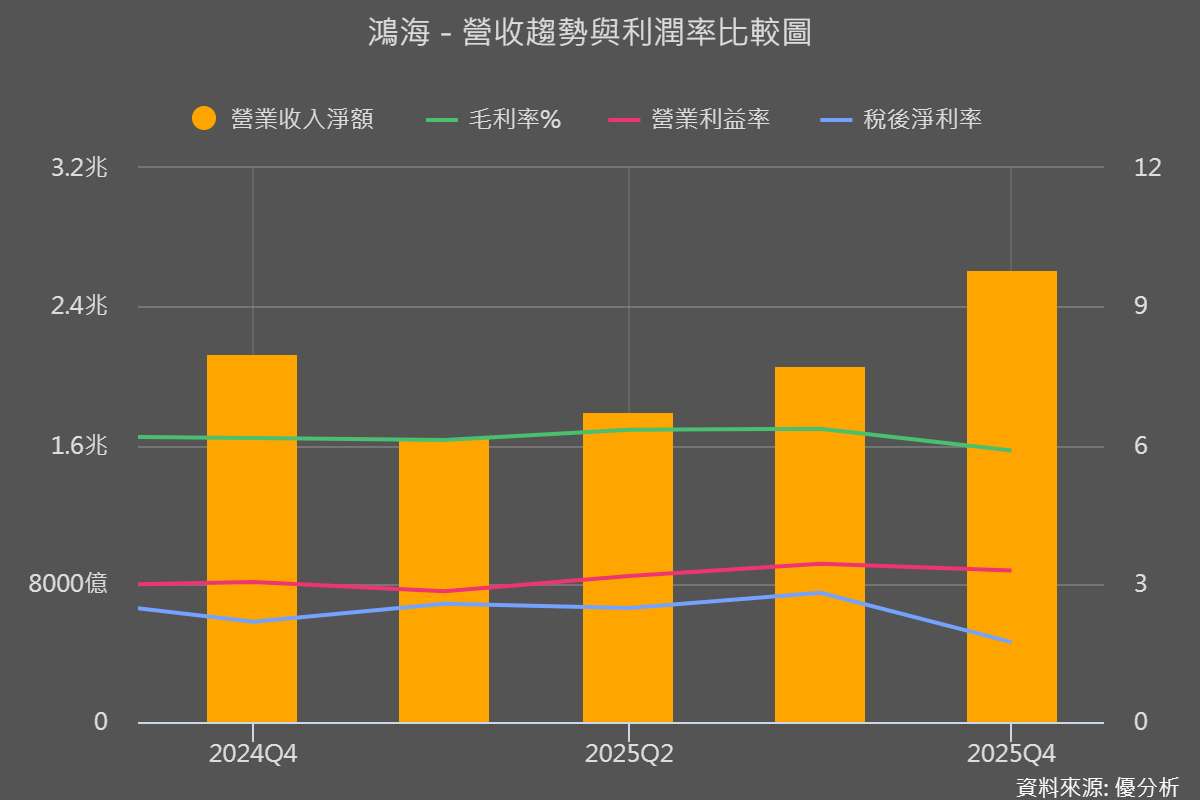 在投資的世界裡,我們最想找的是「三率三升」(毛利率、營業利益率、稅後淨利率同時成長)的公司,這代表企業正處於強勁的擴張期。但鴻海這次卻反其道而行: