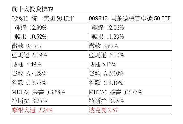 在台股掛牌的美股 ETF 中,多數產品往往分散布局至上百甚至數百檔成分股;以 50 檔精選標的為核心的設計相當罕見。現階段市場以統一美國 50(009811) 與 貝萊德標普卓越 50(009813) 為採用類似 0050 的策略架構。本文將對兩檔 ETF 進行體檢,並納入 0050 作為對照。