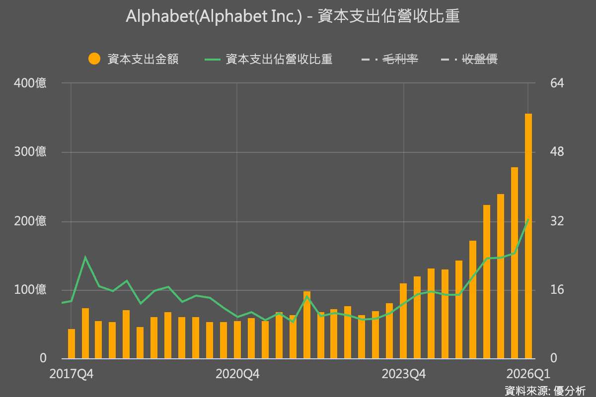 為支應AI需求,Alphabet持續擴大資本支出。在上一季的資本支出達356.7億美元,較去年同期大幅成長,從投資強度來看,資本支出佔營收比重攀升到32%之上創歷史新高;全年方面,公司將2026年資本支出預測上修至1,800至1,900億美元,高於先前預估的1,750至1,850億美元,並預期2027年仍將進一步增加。