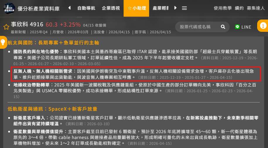 這些預算主要投入無人機、反無人機、軍用通訊與戰場資訊系統,而這些領域正是事欣科目前供應的產品應用,形成穩定且長期的需求來源。