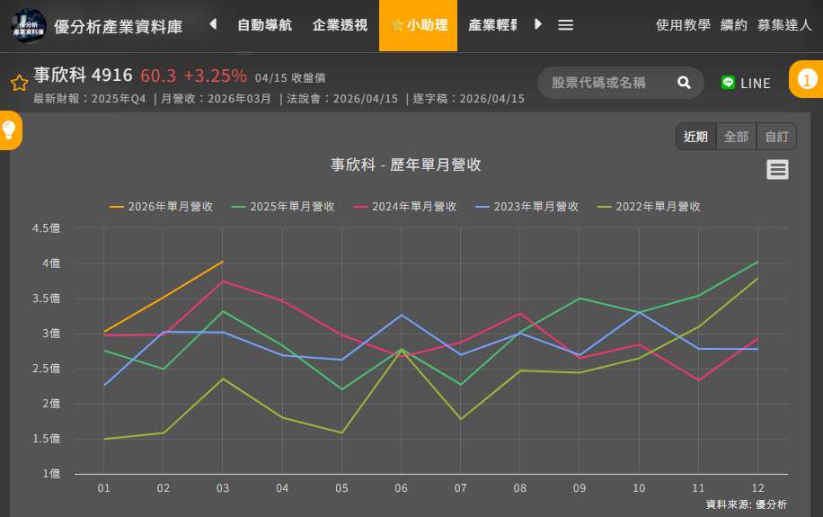 2026年04月16日(優分析/產業數據中心報導)⸺ 先從營收看起,就可以明顯感覺到事欣科(4916-TW)已經進入不同階段。