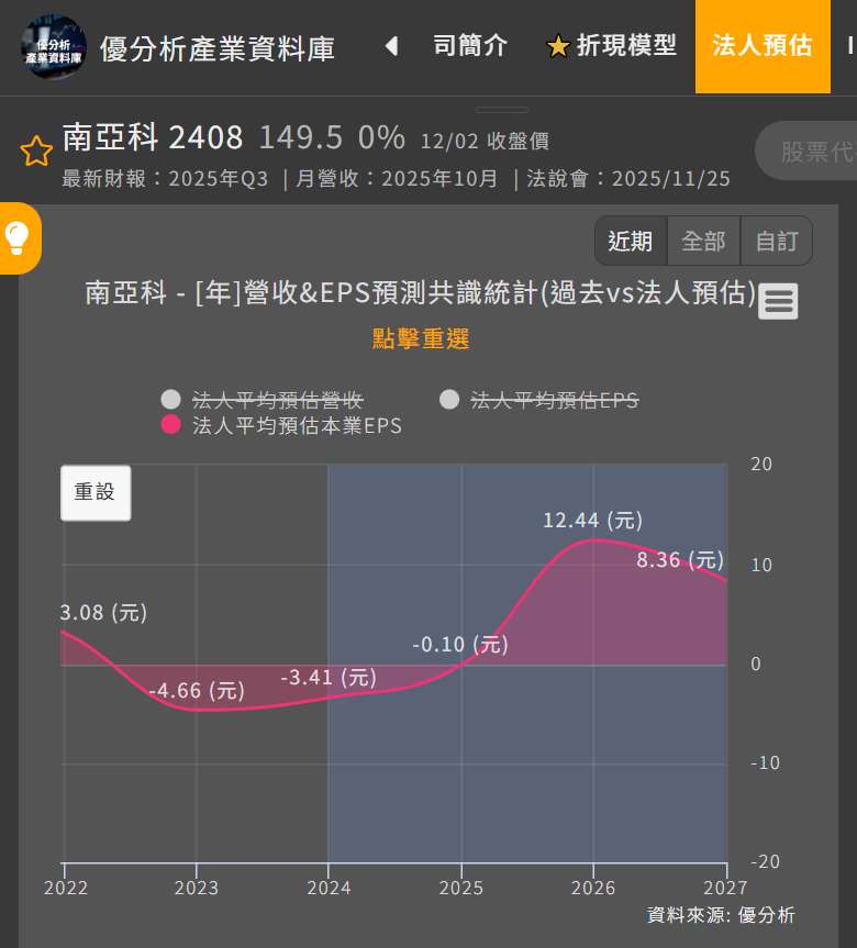 觀點: 這屬於「撿到槍」的機會,預期會有1至2季的蜜月行情,適合波段操作。根據《優分析產業資料庫》的數據,南亞科明年法人預估EPS上看10元甚至更高,但長線技術仍落後國際大廠,需留意見好就收。
