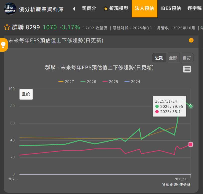 觀點: 群聯作為NAND Flash控制晶片龍頭,庫存水位高且獲利爆發力強。雖然股價經歷修正,但第三季獲利優異,且9月營收起漲,在根據《優分析產業資料庫》的數據,顯示法人預估明年EPS有機會挑戰70-80元,本益比若以20倍計算,長線股價潛力可期。