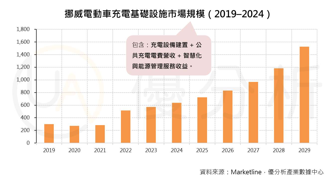 先從宏觀層面來看,研調機構MarketLine指出,截至2024年,挪威電動車充電基礎設施市場規模已達6.5億美元,預計到2029年將成長至 15.3億美元,年均複合成長率仍將高達18.9%。