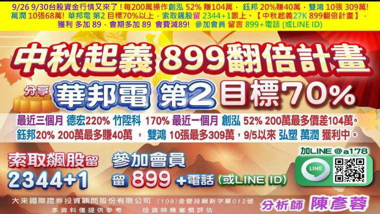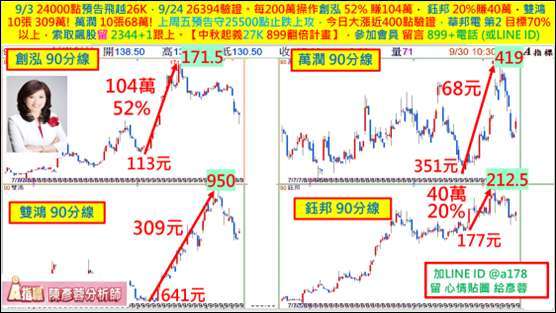 9/4 本欄預告 台股將飛越 26K,9/24 ,26400 達陣! 9/23 說權值股恐怖的來了,果然連殺三天。9/26 盤中 LINE 發文提醒 25500 如守穩,台股止跌上攻擊 27K,有加 LINE 粉絲團留 777+1,與會員,率先得到飆股領先上車提醒。九月會員代表作,雙鴻 306 元,創泓科技 (7714-TW)52% 鈺邦 (6449-TW) 20%,參加會員一起打拼的朋友,歡迎留 777 + 電話 給彥蓉。