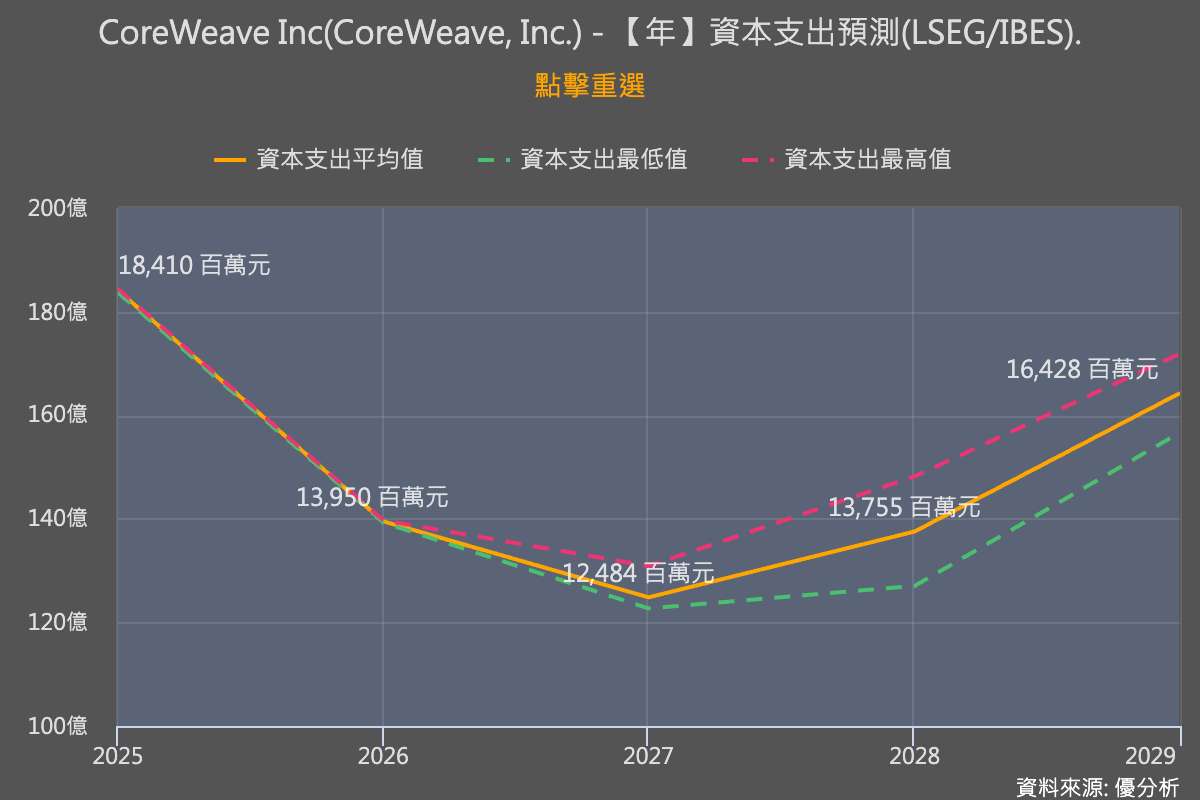 今年公司預估資本支出將達 200 億至 230 億美元,主要用於資料中心的建置與擴充,遠高於市場平均預估的 184 億美元,對於一家手上現金僅有11億、股本僅38億美元、今年預估營收約46億、且尚未達到營運現金流入的公司來說,這個超乎預期的資本支出,代表著相當大的槓桿,讓63億美元的訂單看起來並不算大。因此,從下圖也可以看出,分析師普遍預期未來 CoreWeave 的資本支出將逐步下降,否則難以持續。